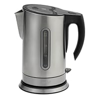 A useful kitchen or home-office companion, this electric kettle quickly brings up to 2 liters of water to a rolling boil. Simply press the push-button lid to fill at the sink, return the kettle to its 360-degree base, and flip on the power switch. Once the water inside has reached a full boil, the unit will shut off automatically for safety and peace of mind. Use boiled water from the kettle to make anything from hot tea, instant coffee, and hot cocoa to instant oatmeal, noodles, baby formula, and more. The cordless unit lifts off its power base and provides a generous stay-cool open handle and an elegantly curved drip-free spout for gracious serving. Other highlights include a water window with measuring marks, boil-dry protection, an easy-to-clean removable decalcification filter that keeps particles out of the water, and cord storage with a cord-length adjustment option to keep countertops looking tidy. The unit should be hand washed only and a user manual comes included. Beautifully housed in brushed stainless steel, the electric water kettle measures approximately 4-3/5 by 7-1/5 by 8-2/7 inches and carries a one-year limited warranty.