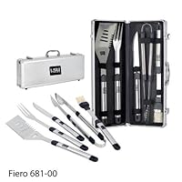The Fiero from our Platinum Collection contains the essentials you will need to prepare a phenomenal barbecue feast.The Fiero barbecue tools set features an attractive aluminum carrying case with faux leather interior, a comfort-grip handle, and elastic-reinforced hook and loop closures to keep tools secure while in transit.It includes five aluminum-handled tools with safety thumb grips and large eyelets to allow you to hang the BBQ tools.The Fiero includes: 1 extra-large stainless steel spatula with serrated edge and integrated bottle opener, 1 large stainless steel BBQ fork, 1 large stainless steel BBQ knife, 1 pair of stainless steel tongs, and 1 basting brush.The Fiero makes a perfect gift for those who takes their grilling seriously.