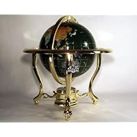 This unique gemstone globe is brand new and in perfect condition. It is painstakingly handcrafted by the most talented artists by, using more than 30 different semi-precious gemstones from all over the world! This globe have used large amount of malachite that pulverized, and mixed With an epoxy And Poured to make the ocean part of the globe (it is a very complicated and expensive procedure, precise control of temperature is the most essential factor in the processing cycle). This is a huge amount of striking and dramatic hand-crafted stone work. This globe is built with the beautiful ornate, 3-leg heavy gold stand into which the globe has been carefully mounted. At the bottom of the stand, a precise glass-topped integral brass compass is incorporated to complement the globe. Each country is inlaid from a different stone, and the stones are individually cut and ground to exacting interlocking shapes, polished and set into this exquisite piece of art with care and attention to adjacencies. The elements of the globe are created out of lapis lazuli, mother of pearl, amethyst, African jade, tiger's eye, jasper, turquoise, purple quartz, onyx, unakite, abalone, green marble and many other beautifully hued and richly veined stones. The latitude and longitude lines are very thin ribbons of polished brass, embedded through the globe. Each globe requires ten individual steps to compose and it takes more than 500 hours of labor to complete!11" Tall, globe itself is 6" in Diameter